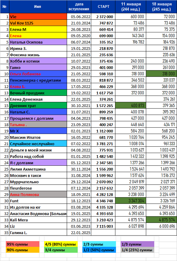 Привет всем! На этой неделе у нас прибавилось ещё трое новеньких, и я в их числе! Теперь мне будет намного интереснее вести марафон! Наша обновленная таблица выглядит так: Снова, как обычно, 35 участников. Кто же эти новички? На 7 строчке - Фоксина жизнь. На 35 - Галина L (временно, пока нет суммы долга). Ну и я на 14 строчке. И я, кстати решила перекроить свои таблички, синхронизировать их с марафоном. Если раньше моей точкой отсчета была дата 5.10.2024 и исходная сумма 410 тысяч, то теперь начало погашения я буду считать с 22.01.25г, а сумму - 374261р. А вот срок погашения я оставляю прежним: в планах у меня рассчитаться с долгом в августе 2027г, то есть остается 44 месяца. Платеж по такому графику всего около 8500, но я буду стараться платить больше. И сегодня я уже могу отчитаться о первом результате: мой долг немного уменьшился. Показываю таблицу: Вот такие у меня дела. Ну а у вас как? Пишите, рассказывайте!