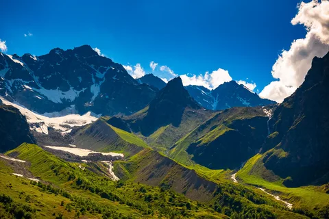 - Разнообразие. Кавказские горы сочетают разные ландшафты: от снежных вершин до зелёных лугов.
