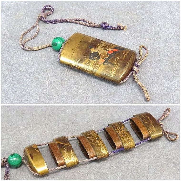 В статье об экипировке японских воинов мы упоминали мешочек для лекарств и противоядий — Инро. Предмет весьма замечательный! Пережив смутное военное время, этот мешочек трансформировался в своеобразную коробочку для мелочей. В мирное время инро стали изготавливать из дерева, бамбука, кости. Это была продолговатая (чаще прямоугольная) с закруглёнными углами коробочка из нескольких секций, вставлявшихся друг в друга и закреплённых шнуром. Носились инро на поясе оби, а чтобы они не выскальзывали из-под него, в качестве противовеса на шнурок подвешивали нэцкэ (небольшие фигурки из кости или дерева). Хранили в инро разные мелочи: по-прежнему — лекарства, а также монеты, личные печати и т. п. Инро покрывали росписью, инкрустацией, гравировкой, лаком. Старались, чтобы сама коробочка, фигурка-противовес и закрепляющая бусина (оджимэ) были выдержаны в одном стиле. Со временем инро превратились в настоящие произведения искусства. На фото представлены как традиционные инро, так и коробочки необыч