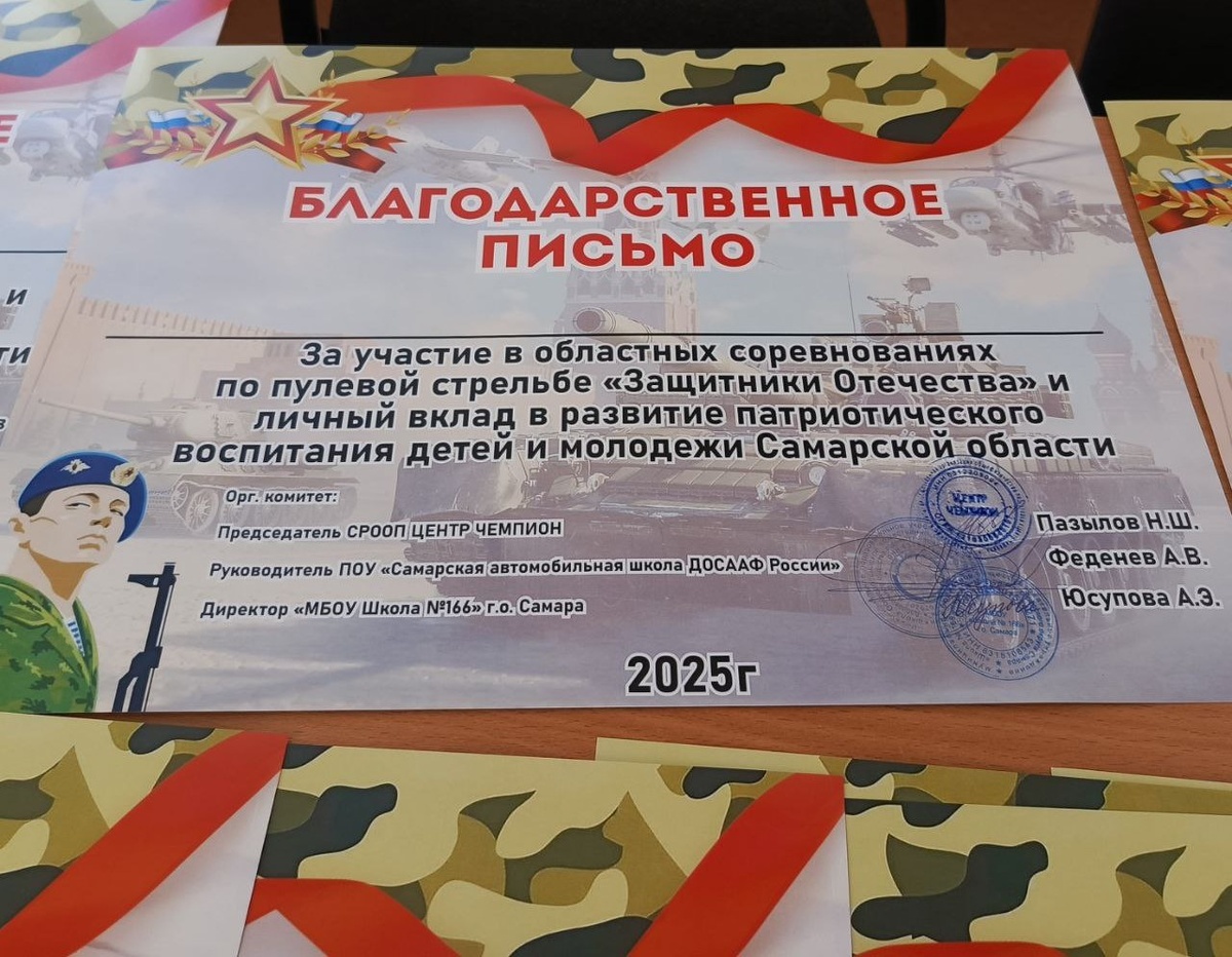 Самарская автошкола ДОСААФ России приняла участие в организации и проведении городского турнира по пулевой стрельбе «Защитники Отечества», в которых приняли участие военно-патриотические клубы и юнармейские отряды Самарской области. Соревнования проводились на базе МБОУ Школы №166 г.о. Самара в рамках Всероссийского месячника оборонно-массовой работы и были посвящены 98-ой годовщине со дня образования ДОСАФ России. Учредителями соревнования стали СРОООП Центр «Чемпион», ПОУ «Самарская автомобильная школа ДОСААФ России» и МБОУ Школа №166. Начальник Самарской АШ ДОСААФ России Александр Феденев и заместитель начальника автошколы Алексей Михно приняли участие в работе судейской коллегии и в церемонии награждения победителей. Призовые места в командном зачете по итогам соревнований распределились следующим образом: 1 место – МБОУ Школа № 176; 2 место – МБОУ Школа № 166; 3 место – МБОУ Школа № 45 и МБОУ Школа № 86.