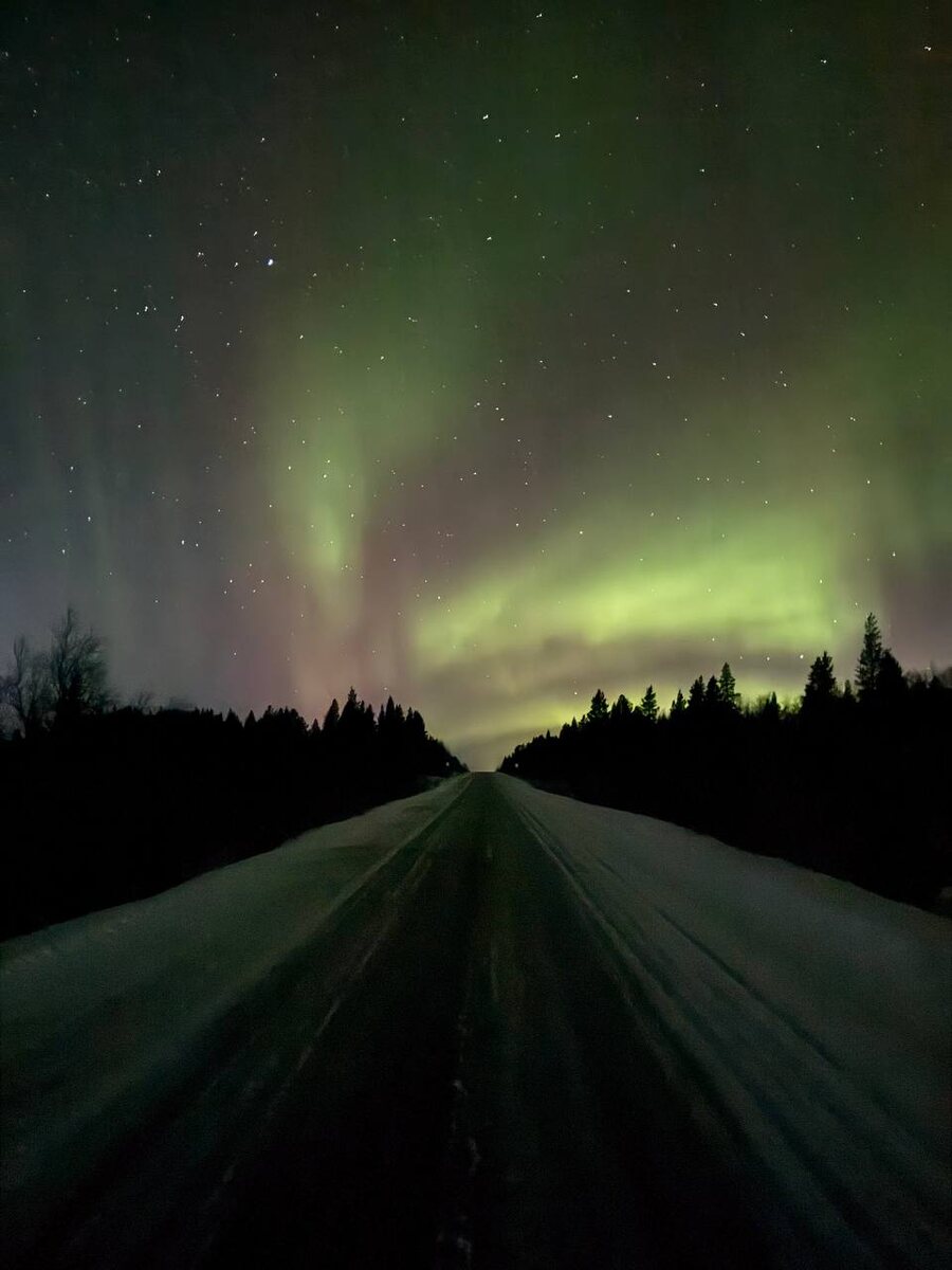 Северное сияние Моя первая охота за северным сиянием превратилась в ночную гонку по пустынной зимней автотрассе. Если в окне мы видели на небе яркое свечение, то следовала резкая остановка. Северные сияния были разной интенсивности и размера. Сначала были очень слабые и небольшие. А потом я увидел очень яркую дугу похожую по форме на радугу, но зеленого цвета и динамично меняющейся формы. Очень необычное и завораживающее зрелище!