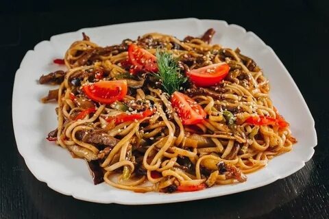 Спагетти с полезными овощными добавками и грибами. Брокколи, морковь, сладкий перец и лук обжариваются с грибами, а потом соединяются с готовыми спагетти. Пряности и соевый соус придают приятный вкус и аромат.