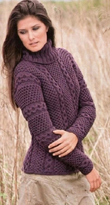 Замечательный свитер цвета баклажан😍 Размеры: 36/38 (46/48) Вам потребуется: 900 (1050) г цвета баклажана пряжи Bingo melange (100% мериносовой шерсти, 80 м/50 г); прямые спицы № 4,5; круговые спицы № 4,5 и № 5; крючок № 4. Платочная вязка: лиц. и изн. р. — лиц. п Лицевая гладь: лиц. р. — лиц. п., изн. р. — изн. п. Основной узор: число петель кратно 28 + 2 кром. Вязать по схеме, на которой приведены только лиц. р., в изн. р. петли вязать по рисунку. Повторять между кром. раппорт и с 1-го по 8-й Р- Резинка, круговые р.: попеременно 2 лиц., 2 изн. Плотность вязания: 26,5 п. и 26,5 р. = 10×10 см. Внимание! Пуловер вяжется целиком от нижнего края переда. Описание работы: набрать 88 (110) п. и связать для планки 1,5 см = 3 р. платочной вязкой, при этом начать с 1 изн. р. и 2 р. лиц. глади и в изн. р. равномерно прибавить 26 (32) п. = 114 (142) п. Затем вязать основным узором. Через 40 см = 106 р. от планки дополнительно набрать для рукавов с обеих сторон 3 п. и в каждом 2-м р. 1 х 5, 2 х