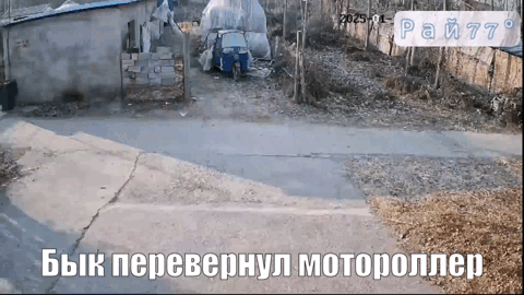 Рогатый обитатель китайской фермы продемонстрировал свой буйный нрав и, находясь в кузове мотороллера, опрокинул транспортное средство своего хозяина. Китайский фермер столкнулся с проблемой, когда попытался переместить парнокопытного зверя. Видеокамера, установленная над сельской автомагистралью, запечатлела, как бык при попытке совершить побег, опрокинул на бок транспортное средство. Автор видео, предоставленного Рай77°, не уточнил последствий происшествия. »»ВИДЕО««