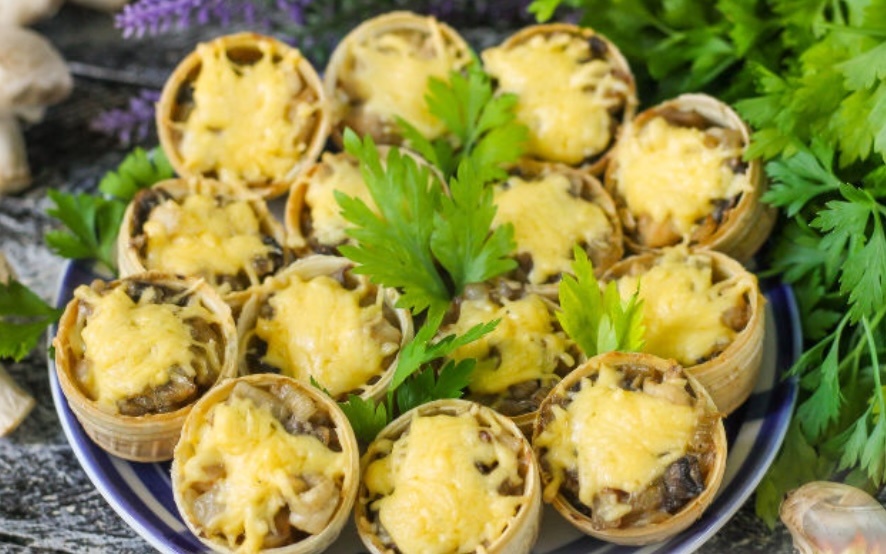 🍽️ 6 порций ⏰ 30 мин Подготовьте необходимые ингредиенты для тарталеток с курицей и грибами. Промойте грибы, также промойте куриное филе, срежьте с него пленки, очистите лук и промойте. Нарежьте мелкими кубиками куриное филе и луковицу. Грибы - средними кубиками, так как они сильно уменьшатся в размерах. Разогрейте сковороду с растительным маслом на плите. Всыпьте в нее все нарезки и соль, перемешайте и обжаривайте все в течение 7-10 минут до румяности. Влейте сливки любой жирности и томите блюдо еще 2-3 минуты на минимуме огня. В это время натрите твердый сыр на мелкой терке. В каждую тарталетку чайной ложечкой выложите приготовленную горячую начинку. Разогрейте духовой шкаф до 200 градусов. Выложите в тарталетки натертый сыр и сразу же отправьте их в духовку на 5-7 минут. Как только сыр расплавится и подрумянится - ваше блюдо готово. Переложите тарталетки с противня на блюдо, дайте им слегка остыть и подавайте теплыми на стол, украсив свежей зеленью.