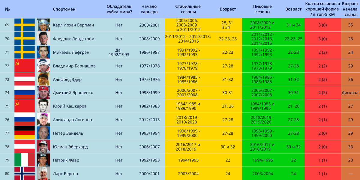 39) Себастьян Самуэльсон – олимпийский чемпион в эстафете (2018), серебряный призер Олимпийских игр 2018 года в гонке преследования, двукратный чемпион мира, многократный призер чемпионатов мира. Лучшие сезоны: 2020/2021 – 2024/2025 (6, 3, 14, 9, 5 в Кубке мира). Все еще выступает, очень вероятно, что кол-во успешных сезонов увеличится.