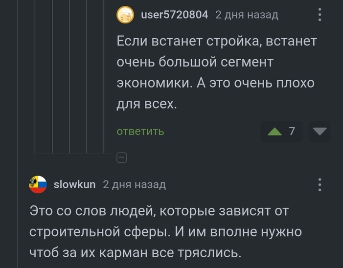 Сразу оговорюсь, имею к строительству крайне посредственно отношение, три года назад работал в лифтовой сфере и 5 лет помотался по стройкам. (Работаю руками, плачу ипотеку за первичку, если вдруг это важно) Итак, почему Строительство это действительно большой сегмент экономики Строительство (и будем сюда ещё писать ремонт (ремонт вторичек имеет крайне низкий процент, чтобы влиять на далее описаное)) Уменьшение строительства, это: Уменьшение количества рабочих мест на самой стройке (охранники, крановщики, опалубщики, стропальщики, различные разнорабочие, каменщики, различные отделочники по внешке, весь управляющий персонал) 2. Уменьшение рабочих мест логистики, привезти стройматериалы, увезти мусор, рабочие на мусорных полигонах, логисты (далее логисты будут плюсоваться к любой сфере с продажей/доставкой) 3. Рабочие места внутренней отделки, тут раскрывает тему шире: 3.1 Сантехника - сантехники, магазины сантехники, менеджеры по её продаже, производства сантехники, производства сырья дл
