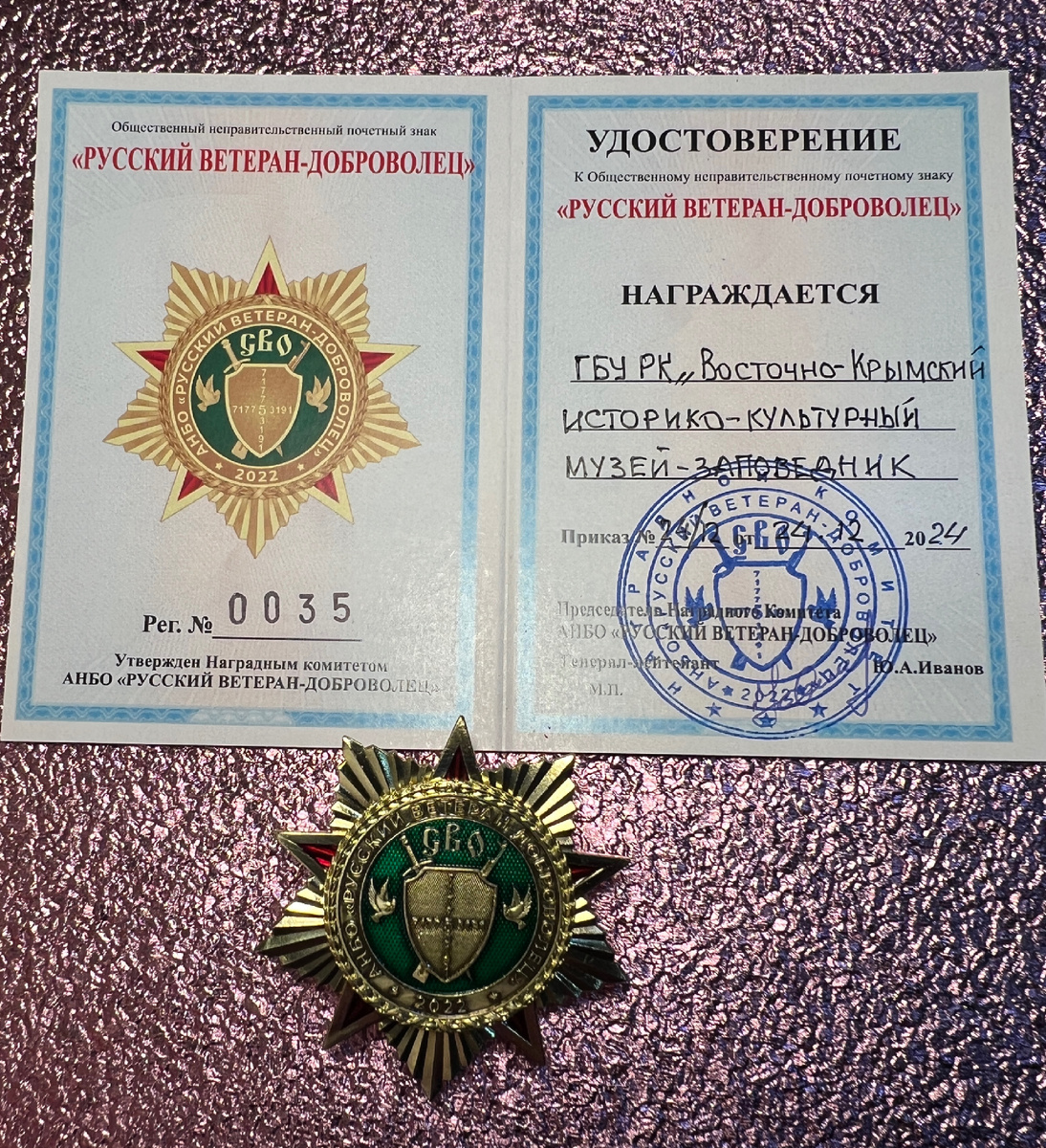 ГБУ РК «ВОСТОЧНО-КРЫМСКИЙ ИСТОРИКО-КУЛЬТУРНЫЙ МУЗЕЙ ЗАПОВЕДНИК НАГРАЖДЕН ПОЧЕТНЫМ ЗНАКОМ «РУССКИЙ ВЕТЕРАН-ДОБРОВОЛЕЦ»