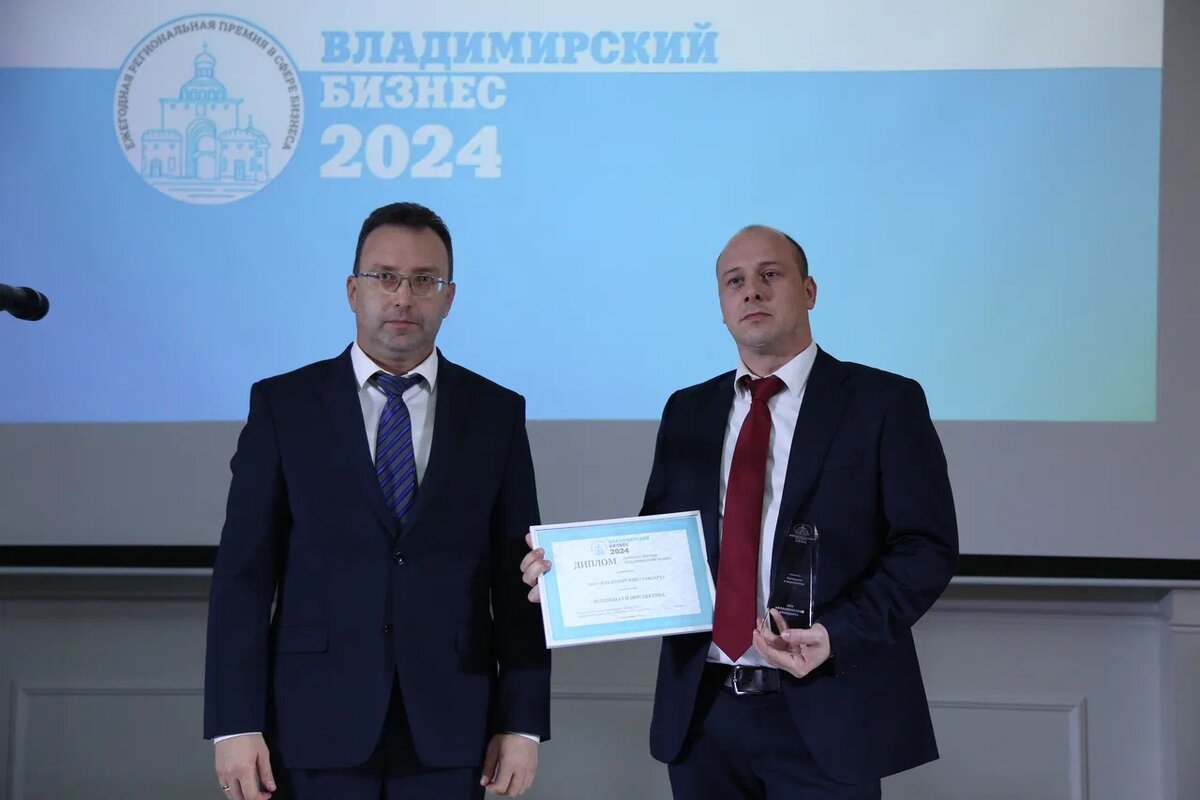 Первый вице-губернатор Дмитрий Лызлов вручил статуэтку премии "Владимирский бизнес-2024" ООО "Владимирский стандарт"