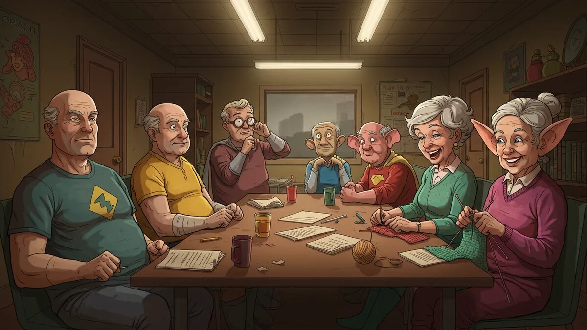 Вечером в центре небольшая группа собралась в угловой комнате. Свет от старых ламп мигал, а ободранный стол стоял посреди комнаты.