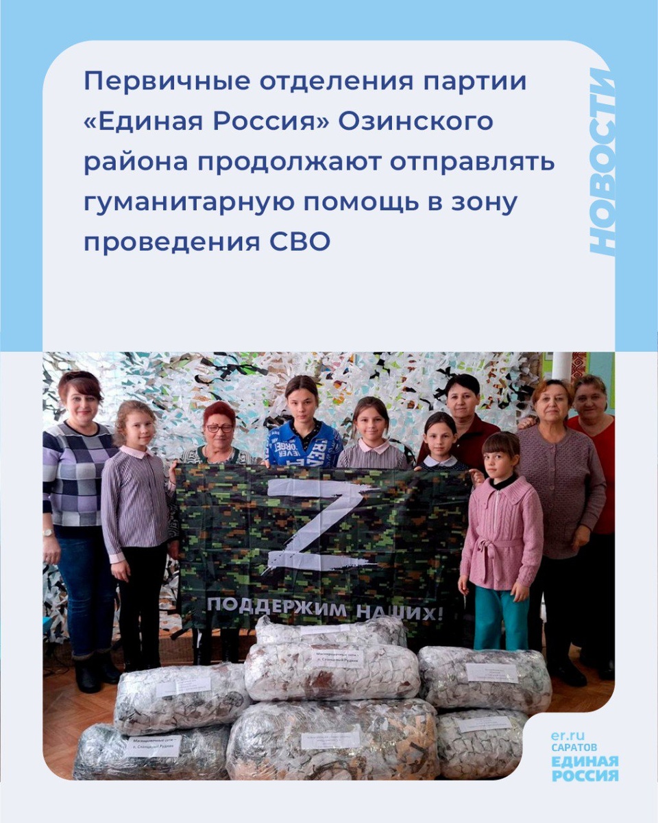 Маскировочные сети и гуманитарную помощь для бойцов, выполняющих свой долг в зоне проведения специальной военной операции, передали активисты Сланцерудниковского первичного отделения партии «Единая Россия» вместе с главой Сланцерудниковского муниципального образования Еленой Кулибабиной и членом общественного Совета Еленой Борзиковой передали для отправки.