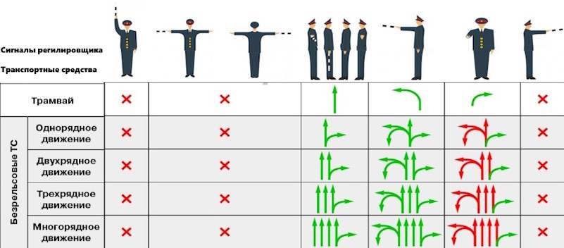РУКИ ВЫТЯНУТЫ В СТОРОНЫ ИЛИ ОПУЩЕНЫ:со стороны левого и правого бока разрешено движение трамваю прямо, безрельсовым транспортным средствам прямо и направо, пешеходам разрешено переходить проезжую часть;со стороны груди и спины движение всех транспортных средств и пешеходов запрещено.ПРАВАЯ РУКА ВЫТЯНУТА ВПЕРЕД:со стороны левого бока разрешено движение трамваю налево, безрельсовым транспортным средствам во всех направлениях; со стороны груди всем транспортным средствам разрешено движение только направо;со стороны правого бока и спины движение всех транспортных средств запрещено;пешеходам разрешено переходить проезжую часть за спиной регулировщика.РУКА ПОДНЯТА ВВЕРХ:движение всех транспортных средств и пешеходов запрещено во всех направлениях, кроме случаев, предусмотренных пунктом 6.14 Правил.