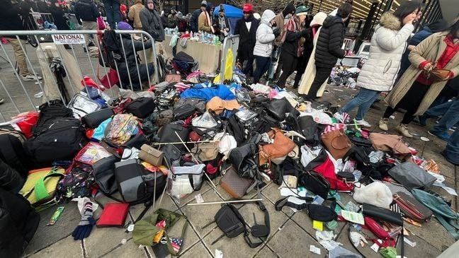 Тысячи сумок, рюкзаков и кошельков были выброшены у входа в Capital One Arena в Вашингтоне в день инаугурации президента Трампа