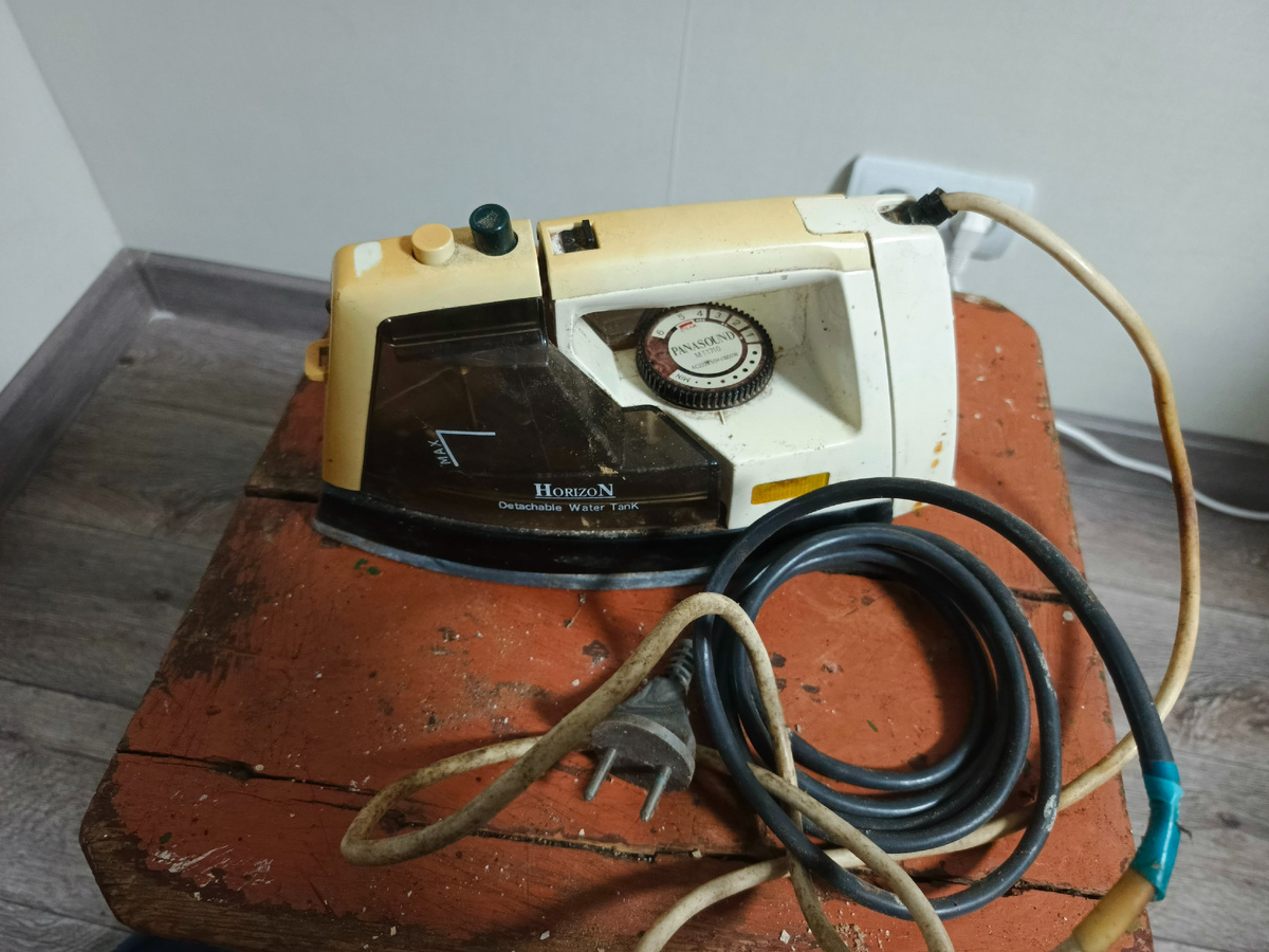 Всем привет! Сегодня по плану у нас разбор. И разберём мы вместе с вами утюг, который я недавно нашел в гараже. Несколько лет назад он пришёл в негодность, его отнесли в гараж и напрочь про него забыли. А я на днях там разбирал и этот утюг нашел. Ну что, давайте его разберём и посмотрим, что интересного и ценного можно найти внутри. Ну силовой шнур вроде на месте, так что несколько грамм меди по любому из этого утюга мы уже достанем. Но это после обжига. А сейчас давайте посмотрим, что находится внутри самого утюга. На пластиковом корпусе утюга было написано "Horizon". А на крутилке, которой, я так понимаю, изменялась температура нагрева утюга, было написано уже другое название — "Panasound". Я так понимаю, это отсылка к известному бренду "Панасоник". Только это не бренд, а всего лишь китайская копия. Но вот не совсем понятно, как же все-таки утюг называется? Хоризон или Панасоунд? Еще на задней части утюга была наклейка, где отмечено, под какой программой что гладить. И все — никаких