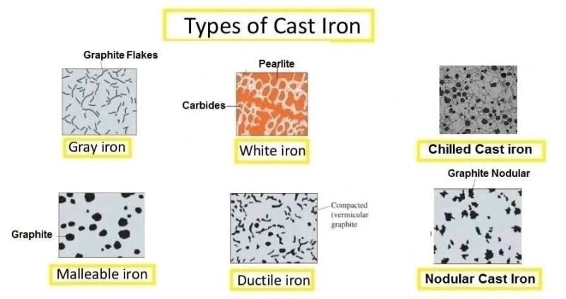 Виды чугуна. 1. Серый чугун: - Свойства: известен своей превосходной обрабатываемостью, высокой амортизирующей способностью и хорошей износостойкостью. Он имеет чешуйчатую структуру графита, которая придает ему характерный серый вид при растрескивании. - Область применения: широко используется в автомобильных деталях, таких как тормозные диски, блоки цилиндров двигателей, а также в основаниях и рамах машин, где требуется демпфирование вибрации. 2. Белый чугун. - Свойства: этот тип чугуна имеет белый кристаллический излом из-за присутствия цементита (карбида железа) вместо графита. Он очень твёрдый и хрупкий, обладает высокой износостойкостью, но плохой обрабатываемостью. - Область применения: используется там, где требуется высокая стойкость к истиранию, например, в футеровках мельниц, соплах для дробеструйной обработки и деталях дробильного оборудования. 3. Ковкий чугун. - Свойства: производится путем термической обработки белого чугуна для превращения цементита в кластеры графита (з