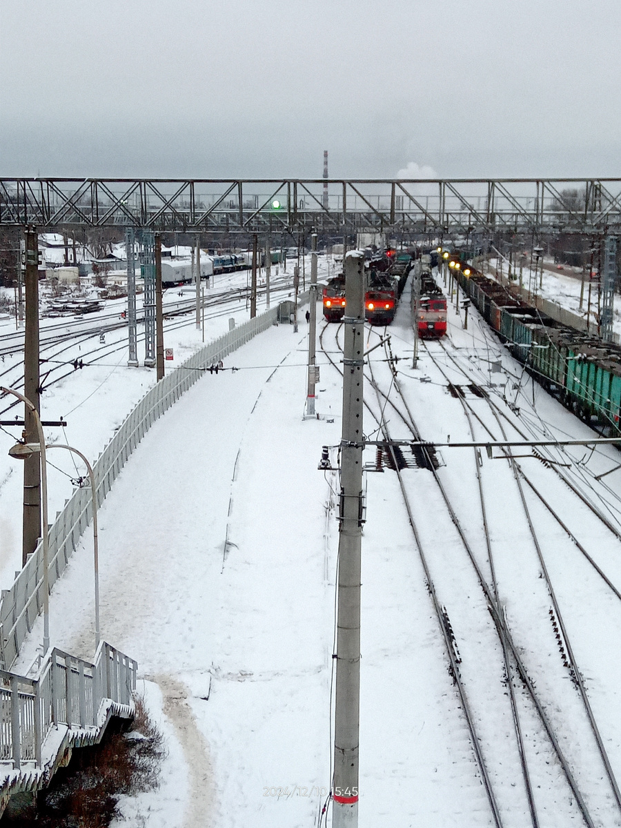 Да, да. Этот тот самый обзор, который должен был бы быть еще до Нового года. Если бы не вмешались странные алгоритмы Яндекс-почты, отправившие его в «Спам». С другой стороны, как там про коньяк говорят? Чем дольше настаивается – тем качественнее вкус? Учитывая, что здесь не горячие новости, то хороший обзор – как раз хорошо выдержанный. И, само собой, отдельное спасибо и мои извинения Игорю Ефремову, который нас балует фотографиями и видео. В общем, дело было так: Сегодня будет достаточно видео и фото. Место съёмки традиционно с моста. 1. экспресс из Владимира. ЭД4М 0502. Обычно в это время он встречается с экспрессом на Петушки, в этот день он опоздал. 2-3. Экспресс из Владимира ЭП2Д встретился с опаздывающей Крутовской электричкой. 4. ТЭМ14 тащит состав на сортировку. 5. А здесь так и напрашивается: трое из ларца, одинаковы с лица. 6. Здесь же поезд один. Пусто. А вдали, слева, синенькие тепловозы? 2 ТЭМ2 и ЧМЭ3. Я даже к зелёным вагонам со стороны города ходил, но увы, загорожены д