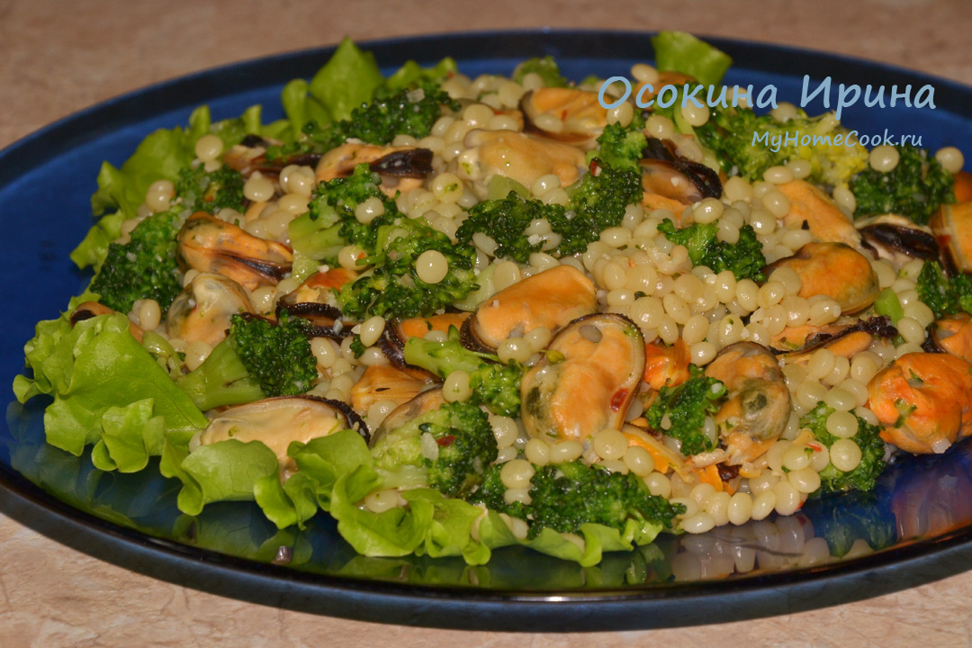 Очень люблю морепродукты вообще и мидии в частности. Сегодня решила не мудрить и приготовила такое блюдо: припустила пару минут в подсоленной воде 200 г замороженной брокколи, откинула и разобрала на мелкие соцветия. В сотейнике распустила 30 г топлёного сливочного масла, добавила 400 г размороженных мидий, по 1/2 ч.л. сушеных лука и чеснока и протушила пару минут, посолила, поперчила, добавила щепоть чили, 1 стакан отваренного в подсоленной воде птитима, промешала, прогрела, добавила подготовленную брокколи, проготовила всё вместе пару минут и сразу подала. Просто и бесподобно вкусно) Приятного аппетита