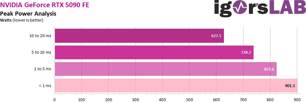 Ни для кого не секрет, что показатель лимита потребления для видеокарты не является абсолютным, и в реальности вполне могут наблюдаться куда более значительные скачки питания во время работы. Обычно эти скачки не очень существенные, но, например, с RTX 30 из-за них некоторые блоки питания попросту уходили в защиту в свое время. Современные БП стандарта ATX 3.1 сертифицированы на работу со скачками питания в 200% (до 1200 Вт) на протяжении 1 мс, а потому им не страшны практически любые сюрпризы со стороны видеокарты. Однако сами цифры потребления в этих прыжках все еще продолжают быть не самыми приятными. Так RTX 5090 способна на участках в 1 мс потреблять до 901 Вт, а на участках в 10-20 мс показатель потребления достигает 627 Вт. Еще раз уточним, что все сертифицированные блоки питания ATX 3.1 способны без проблем выдерживать такие скачки, но вот более старые модели вполне могут триггерить защиту и выключать систему.