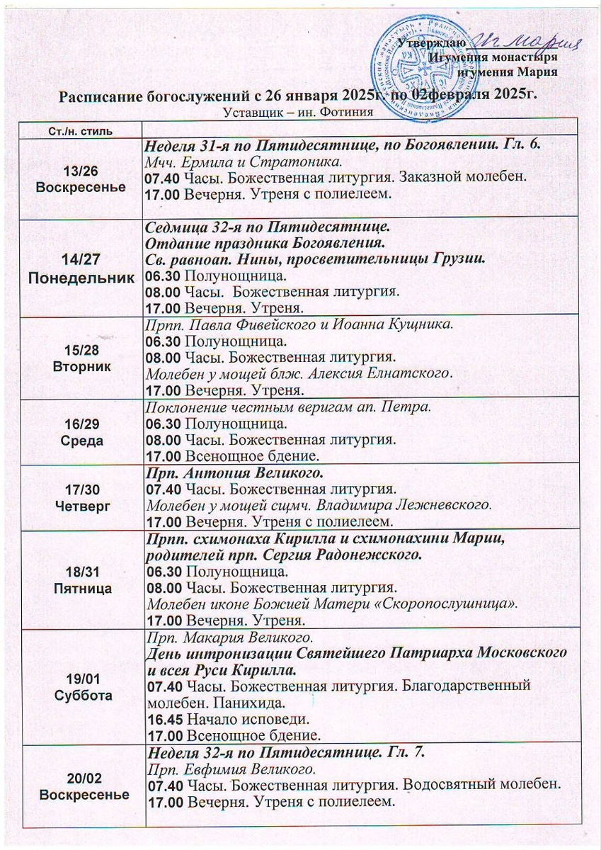 26.01-02.02. Расписание богослужений в Введенском женском монастыре города Иваново