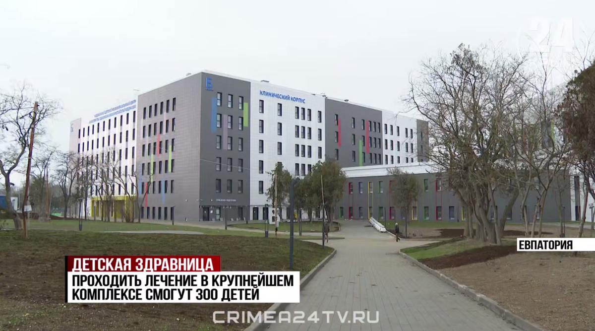 В Евпатории продолжается строительство крупнейшего в России детского медицинского центра. Завершить работы планируется уже в следующем году. Федеральный центр находится на 22 гектарах. Попасть в пансионат можно через центральный вход, столовую и из других корпусов. Такие переходы сделали для удобства как персонала, так и маломобильных пациентов. Строители уже начали монолитные работы шестиэтажного здания. По плану здесь будет 155 номеров для детей и их родителей. «На объекте работают порядка 450 человек. Работы выполняются полным ходом», - рассказал начальник производственно-технического отдела «Федеральный детский реабилитационный центр» от организации-генподрядчика Дмитрий Томин. Первый этап строительства комплекса завершили в конце прошлого года. Сейчас специалисты оснащают консультативно-диагностический корпус, стационар и здания администрации. Параллельно идёт процесс ввода в эксплуатацию. «Если взять в целом лечебный центр, то он готов порядка на 50%, если мы говорим о полной гот