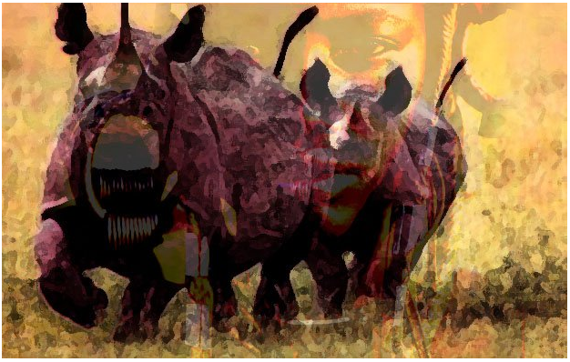 Глядим, а эти броненосцы начали вдруг, ни с того ни с сего, между собой бодаться. На носах по два рога огроменных, то в бок друг друга сунут, то по морде. Шкурища мощная, в складках. Орут! Деревья от маленьких до средних даже не чувствуют, – с корнем навырыв. И постепенно приближаются.
