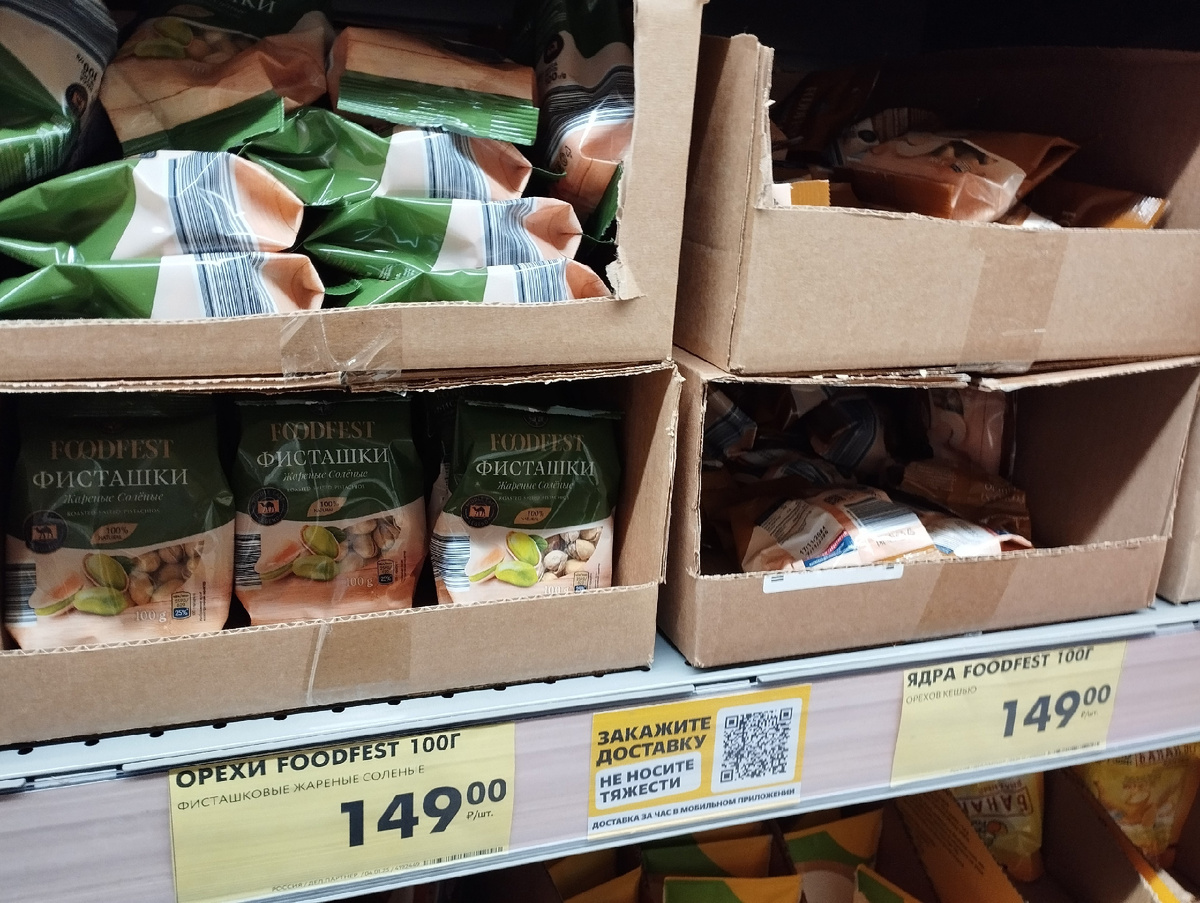 Фисташки просто не могут не нравиться, тем более когда все они крупные, жареные да еще и легко чистятся. Цена такого ореха 149 рублей за 100 гр, такая же стоимость установлена и на кешью. Не спорю, в специализированных магазинах бывает и более низкая цена, но мне не нравится приобретать орехи там, где они все лежат в открытой упаковке, мне нравится такой формат, как в супермаркетах.