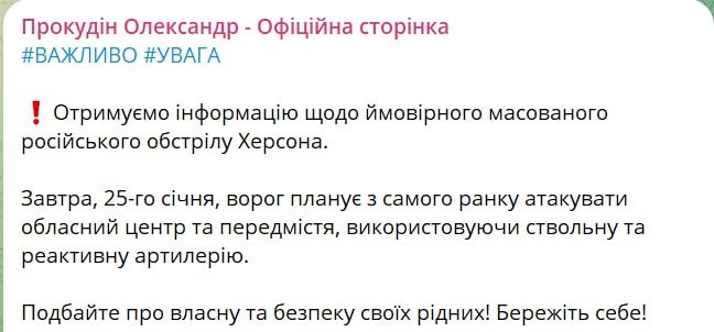 Глава Херсонской областной военно-гражданской администрации (ОВА) Александр Прокудин предупредил жителей Херсона о возможном массированном обстреле. В своём сообщении, размещённом в официальном Telegram-канале, он заявил, что 25 января российские войска могут «атаковать город и пригород», используя ствольную и реактивную артиллерию. Прокудин призвал местных жителей соблюдать повышенную осторожность и готовиться к возможным ударам. «Завтра, 25 января, ВС РФ планирует с самого утра атаковать областной центр и пригород, применяя артиллерию», - написал глава Херсонской ОВА. Несмотря на всю серьёзность сделанного предупреждения, источники, на которые ссылается Прокудин, остаются под вопросом, что вызывает множество сомнений относительно достоверности его слов. Удивительно, что он не указал, на каких именно данных строит свои выводы, и отсутствие конкретных доказательств только усиливает недоверие. А по факту, если же обратиться к предыдущим высказываниям Александра, становится уже не до сме