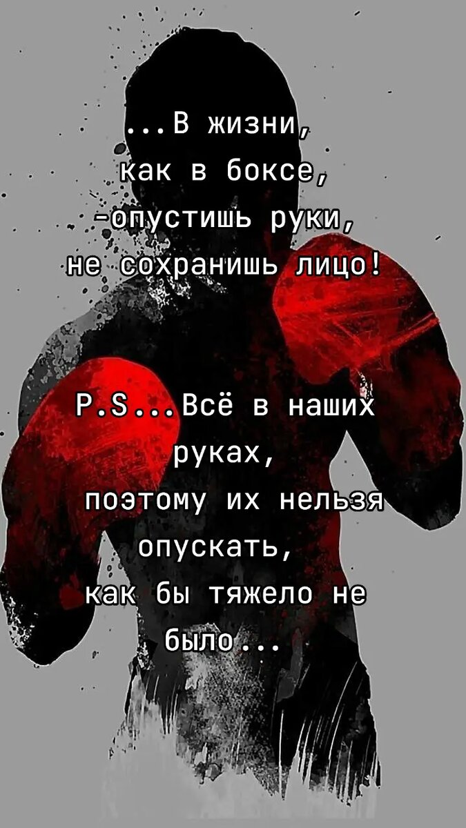 В жизни, как в боксе, важно не только защищаться, но и верить в свою силу. Каждый день — это новый раунд, и каждый твой выбор — это шаг к победе. Так что держи руки вверх, потому что только от тебя зависит, какой будет финальный счёт в твоей игре.