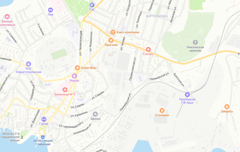 В нижнем левом углу отмечена "автостанция Северная", рядом причал. С Графской пристани, на катере, мы попадаем сюда. А само Братское кладбище находится в правом верхнем углу (на карте видно церковь).