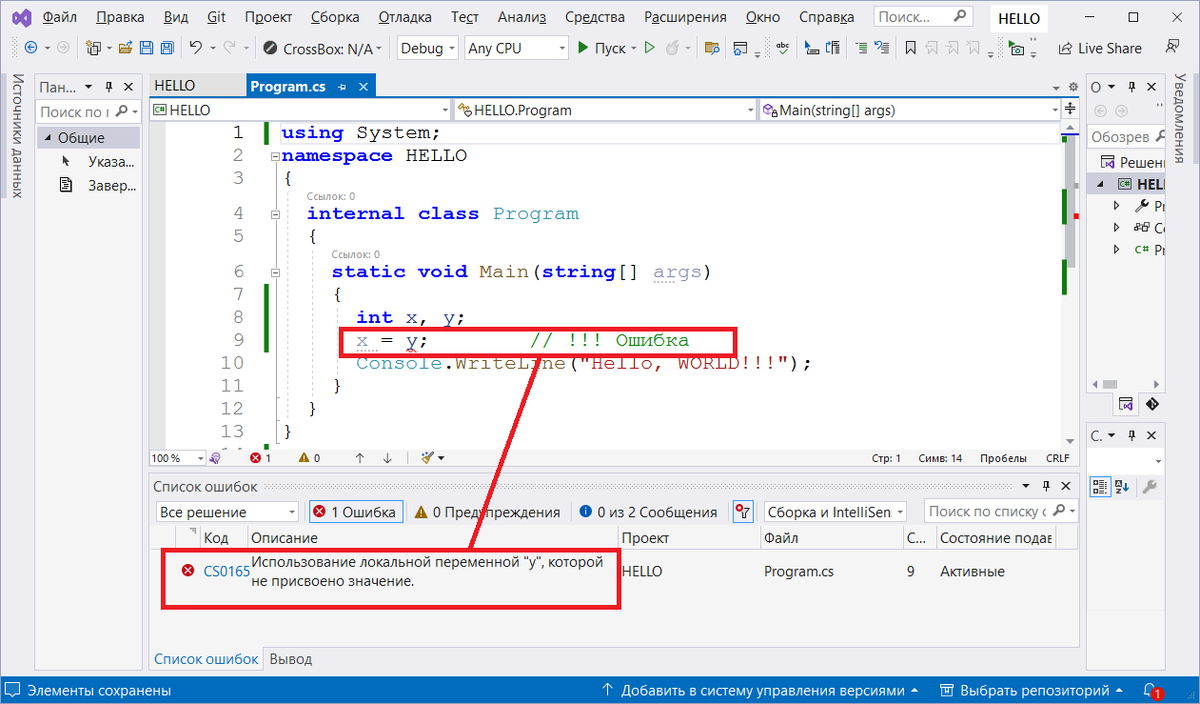 В C# переменные можно объявлять почти в любом месте кода. Это удобно. Однако не знаю почему, но создатели C# почему-то запретили использовать неинициализированные переменные (даже в С++ такого нет). Я, конечно, могу предположить, почему. Если переменная не инициализирована, то в ней теоретически может храниться какой-нибудь мусор. И это в некоторых случаях может привести к труднонаходимым ошибкам. Однако, например, создатели Паскаля (Делфи, Лазарус) из этого нашли простой выход - при объявлении переменные автоматически инициализируются нулевыми значениями. В общем, нравится вам это или нет, но в C# вы не сможете сделать вот так: Это считается ошибкой и программа не будет откомпилирована. Ничего подобного нет не только в Паскале, но и в С++, хотя в С++ автоматической инициализации нет (если я правильно помню). Кстати, в C#, как и в Паскале, при объявлении, например, целочисленной переменной, компилятор поместит в неё ноль. И всё равно использование неинициализированной переменной будет