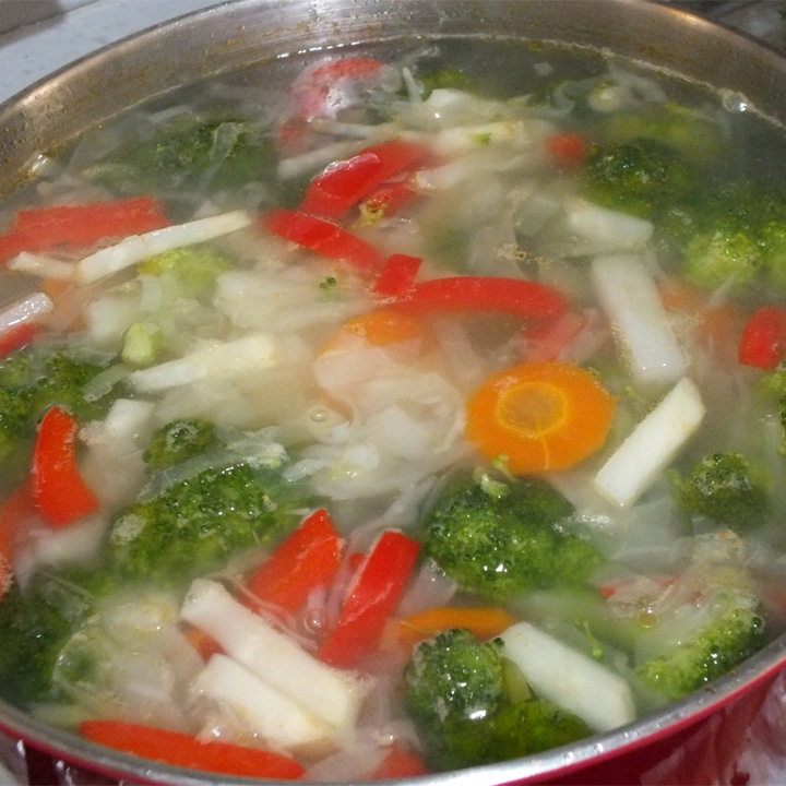 ✔ Бульон куриный – 2 л; ✔ Капуста белокочанная – 200 г; ✔ Кольраби – 1 in. (~100) г; ✔ Брокколи – 100 г; ✔ Морковь – 1 шт.; ✔ Перец болгарский – 1 шт.; ✔ Горошек зелёный – 100 г; ✔ Лук – 1 шт. (среднего размера); ✔ Чеснок – 2 зубчика; ✔ Кинза – несколько веточек; ✔ Соль, перец – по вкусу. Овощи чистим, нарезаем крупной соломкой. Закладываем в кипящий бульон, и варим до мягкости репы (минут 15). За пару минут до готовности добавляем зелень. КБЖУ на 100 г - 21/1,5/0,5/2,3. Можно добавить в тарелку ложку сметаны. Если жирность сметаны – 20%, это добавит к порции около 40/0,6/4/0,7 КБЖУ. Рецепт на странице Автор рецепта – Joey Jane Расчёт КБЖУ сделан с помощью Telegram-чат-бота https://t.me/vesipitaniebot © Почтенный возраст Online и Рецепты для диабетиков
