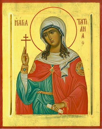 «Когда в Риме вспыхнуло гонение на христиан, всем необходимо было принести жертву богам, и со всеми, кто отказывался исполнить это повеление, жесточайшим образом расправлялись. Среди схваченных оказалась и Татиана. Её привели в храм Аполлона, где пытались заставить поклониться статуе этого языческого бога. Татиана вознесла молитву Господу, и произошедшее землетрясение разрушило статую Аполлона и обрушило часть храма, под которой погибли много людей. После этого Татиану подвергали различным пыткам, но следы мучений исчезали с её тела. Палачи решив, что Татиана занимается волхвованием с помощью своих волос, остригли их и заперли её на два дня в храме Зевса. На третий день жрецы, придя в храм, чтобы принести жертву Зевсу, обнаружили его статую разбитой, а Татиану живой. После этого ей был вынесен смертный приговор, и она была усечена мечом вместе со своим отцом, который видя страдания своей дочери, не пожелал оставаться тайным христианином и пошёл на страдания вместе с ней.