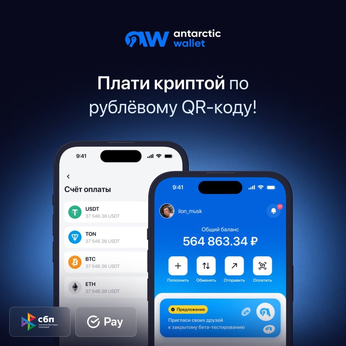 Antarctic Wallet — это криптокошелёк, который позволяет оплачивать покупки в магазинах криптовалютой по QR-коду через систему быстрых платежей (СБП). С помощью Antarctic Wallet больше не нужно искать обменники и беспокоиться о высоких комиссиях. Криптовалюта и рубли конвертируются моментально. Для входа в кошелёк используется Telegram, что позволяет свободно управлять активами без необходимости прохождения процедуры KYC (Know Your Customer — «знай своего клиента»). В настоящее время проходит бета-версия Antarctic Wallet. Чтобы принять участие, необходимо ввести код 3b0c5f76a0.