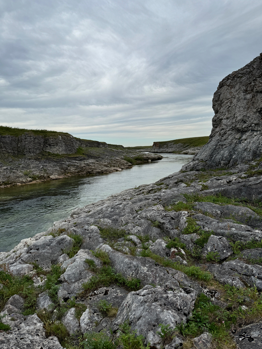 12 августа Сплав по Ния-ю, Каньон. Сегодня нам предстоит пройти каньон реки Ния-Ю. Утром быстро собрала свои вещи, и пока вся остальная компания занималась сборами, решила сходить прогуляться вдоль каньона, посмотреть, что нас ждет, а за одним и проверить, смогу ли я по верху в случае чего обходить пороги. На камнях причудливо растет лишайник. Надо мной кружит и орет какая то птица, видимо у нее гнездо где то рядом, и она пытается меня отогнать. Небо сегодня пасмурное, но все равно тепло. Пока гуляла, Дима С. и Оля приготовили завтрак, пожарили вчерашнюю щуку, приготовили макароны по-флотски. Макарон наготовили много, и оставшуюся от завтрака пайку, прямо в сковородке взяли к себе на катамаран, чтобы обедать прямо на воде. Первый входной порог решили не проходить на груженных катамаранах, поэтому перетащили все вещи за скалу, там загрузились, крепко увязались, и поехали в каньон. На каждый катамаран раздали по рации, наконец то пойдем сложный участок с нормальной связью между ка