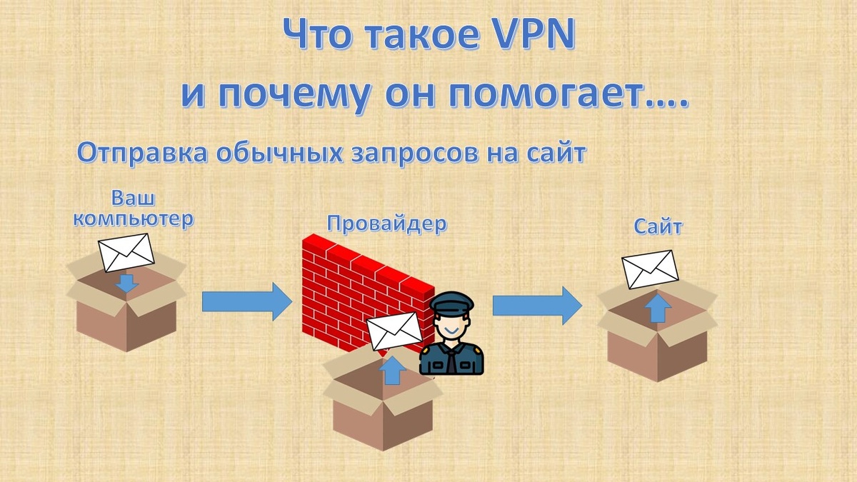 Все, кто пользуется интернетом, сталкивались с блокировкой некоторых, порой очень нужных, сайтов. Многие из этих сайтов блокируются провайдерами по указанию Роскомнадзора. Один из вариантов, обойти эти ограничения - использовать VPN. VPN (ВПН) - переводится как Виртуальная Частная Сеть. Что это значит: Виртуальная - то есть это не реальная сеть, а ее имитация. Частная - значит защищена от внешних лиц. Сеть - значит связывает какое то оборудование между собой. Обычно VPN используется для построения сетей предприятий, у которых офисы находятся, например, в разных городах. Но особенности этой технологии позволяют и обманывать системы, которые блокируют доступ к запрещенным сайтам. За счет чего обеспечивается такая защита? В первую очередь это шифрование. Ваше сообщение может прочитать только получатель. И вскрыть шифр, не зная ключа, очень сложно. Кроме того в VPN используется, так называемое, туннелирование. Когда информация не просто шифруется, а еще разбивается на части, которые отправ