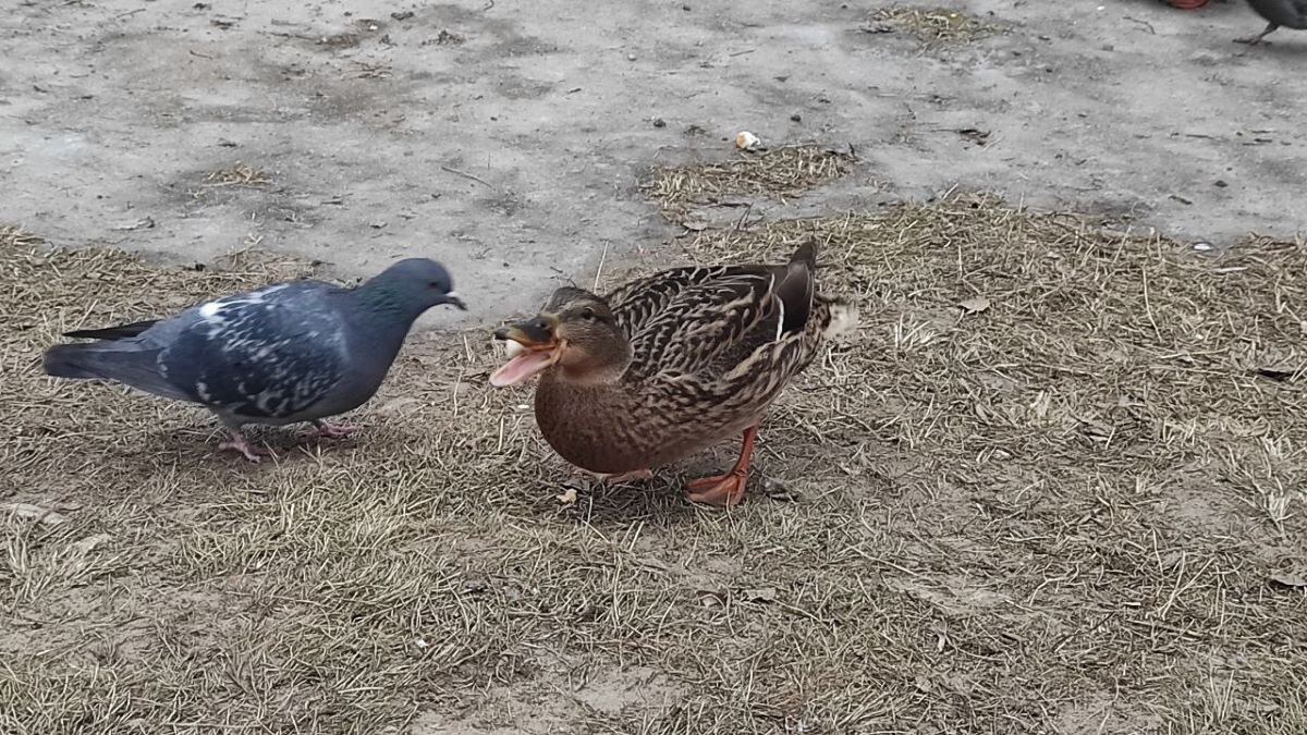 Правда, когда на пруду побывала корреспондент КН, она смогла насчитать там не больше двух десятков крякв. Вперемешку с голубями они прохаживаются в ожидании подачек от людей. И небезуспешно. Зато к обеденному времени на берегу началось настоящее "утиное нашествие".