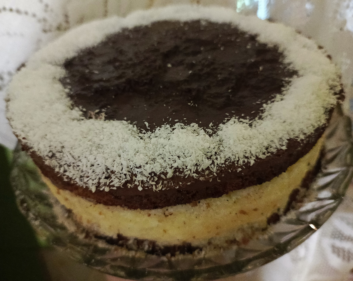 В миску кладем 125 г размягченного сливочного масла и 100 г сахара. Взбиваем миксером. Сюда добавляем два яйца, три столовые ложки молока. Взбиваем. В сито кладем 100 г муки, 2 ст.ложки какао и разрыхлитель. Просеиваем и добавляем в бисквит. Готовое тесто выкладываем в форму, запекаем примерно 40 минут. Бисквит режем на две части, срезая верхушку. Крем для торта: в миску кладем 200 г сливочного масла, 500 мл молока, один стакан сахара и пол стакана манки. Ставим на огонь и непрерывно мешаем венчиком. Доволим до кипения и снимаем с огня. Далее добавляем сюда 200 кокосовой стружки. Перемешиваем. Собираем торт. Кладем первый корж и на него кокосовый крем. Все хорошо распределяем ложкой и сверху кладем второй корж. Глазурь: растапливаем 150 г черного шоколада и 50 мл молока. Поливаем глазурью торт. Торт ставим в холодильник на ночь.