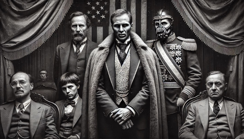 По бокам еще двое... цирк с конями. Пацан мелкий — чистый слизняк: ехидничает, лыбится, волосенки сальные приглаживает, аж передёргивает от него. Второй, в таком генеральском прикиде, в музее, типа, спер мундир с эполетами, вообще зашквар. На харю намордник железный напялил. Он чё, типа, кусается? Короче, шайка масонов из сериала, блевать тянет…