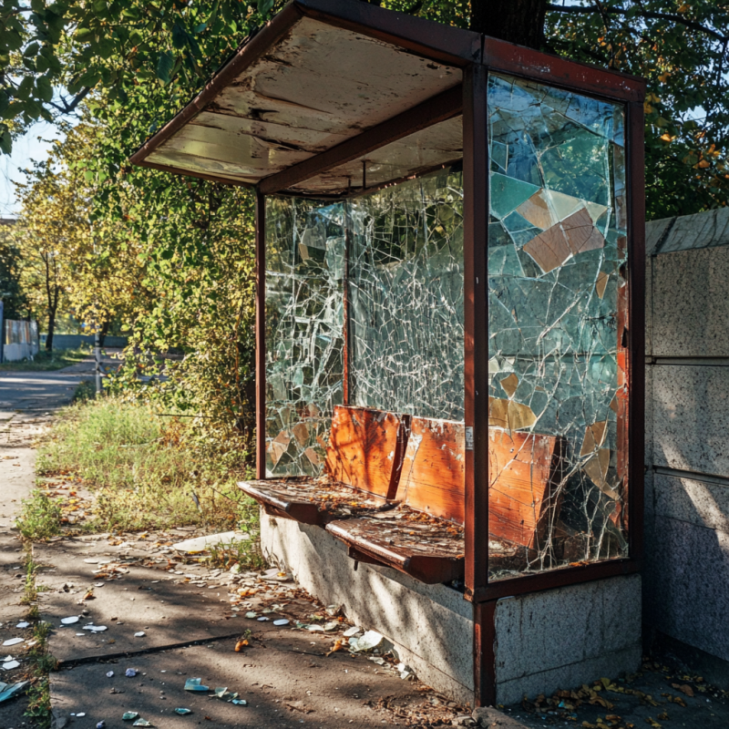 Остановка “Лель” казалась абсолютно заброшенной. Древняя, сооружённая из бетонных плит, когда-то она была выкрашена в голубой цвет. Но краска потрескалась и облупилась. Внутри остановка была полна камнями и битым стеклом, пахло здесь отвратительно.
