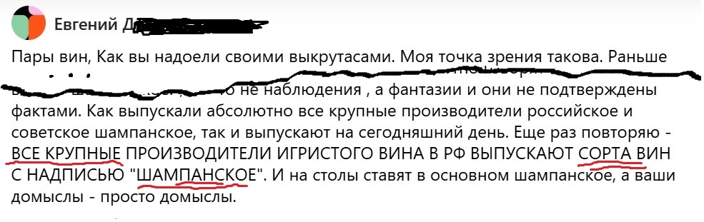 Его смысл в том, что многие люди, и комментатор в частности, считают, что у нас все крупные заводы выпускают тип вина шампанское, которое у всех, или большинства, и стоит в итоге на столе. Это, кстати, предполагается нашим законодательством, в частности, ГОСТом ГОСТ 33336-2015, копирую пункт 3.9, и о том же пункт 3.11.