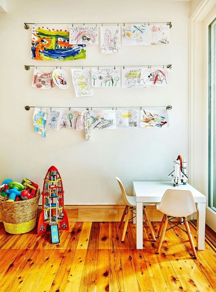У меня сын 6 лет и сейчас такой возраст, когда он ежедневно из сада приносит кучу своих работ. Все подарки от него в виде аппликаций, рисунков и пластилиновых поделок. Что делать с его работами? Может устроить выставку? Посмотрите какие идеи для оформления детской выставки я нашла на просторах интернета. Очень удобно крепить рисунки и менять старые на новые. НО! для того, чтоб закрепить реечки вам придется сделать пару дырок в стене. Если в реечку добавить металлическую полосу, то крепить рисунки станет еще проще. Не знаю, кто это придумал, но смотрится лаконично и функционально. Правда дырки в стене все-таки делать. Никаких стандартов, только творчество! Повесить детские рисунки можно и так... Конструкция кажется не очень прочной, но функцию свою выполняет, ребенок будет рад! Веревочки и прищепки вам в помощь. Как временная конструкция очень даже! У творческой мамы все с "изюминкой". Можно пофантазировать и сделать что-то типа такого... В любом случае ребенок будет счастлив! Мне ближе