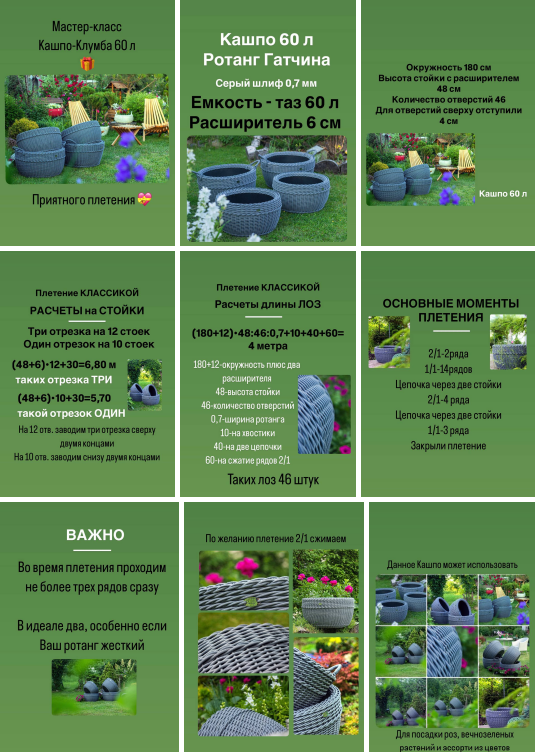 Думаю, любой, даже начинающий плетельщик знает, что такое мастер-класс, благо их как платных, так и бесплатных буквально на каждом интернет-шагу. Как правило, это видео, редко небольшое и информативное, чаще довольно длинное, бывает, что и на несколько частей разбитое, когда записывают чуть ли не каждый шаг в плетении того или иного изделия. Иногда встречаются мастер-классы в формате .pdf, иллюстрированные фотографиями или схемами. А недавно мне попался мастер-класс в виде фотошпаргалок. Такие пока видела лишь у Алены Куртовой из Калининграда. На днях она сделала подарок всем мастерам и представила бесплатный мастер-класс по плетению кашпо. МК сделан как раз в виде фотошпаргалок и состоит всего из девяти страничек: Быстро пролистала шпаргалки и поняла, что речь идет про кашпо на 60 литров, для его плетения используется ротанг Гатчина серый шлиф 0.7 мм, расширитель 6 см. Указано, сколько сантиметров отступить от бортика, сколько отверстий просверлить, каким способом устанавливать стойки