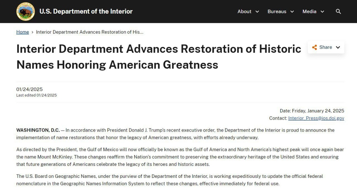 Министерство внутренних дел США сообщило на своем сайте, что «с гордостью объявляет» о переименовании Мексиканского залива в Американский, а самая высокая вершина Северной Америки — гора Денали на Аляске — теперь будет носить имя горы Мак-Кинли. По мнению чиновников администрации Трампа, эти изменения «подтверждают приверженность страны сохранению выдающегося наследия Соединенных Штатов и обеспечению того, чтобы будущие поколения американцев чтили наследие ее героев и исторические ценности», — говорится в пресс-релизе ведомства. В Министерстве добавили, что совет США по географическим названиям уже начал работу над обновлением официальной федеральной номенклатуры. При этом Reuters отмечает, что эти изменения вряд ли будут приняты на международном уровне. Остальные страны по прежнему будут считать залив Мексиканским. Как пишет агентство, гора Денали и раньше называлась в честь бывшего президента США Уильяма Мак-Кинли, но в 1975 году по просьбе штата была переименована в Денали, что на я