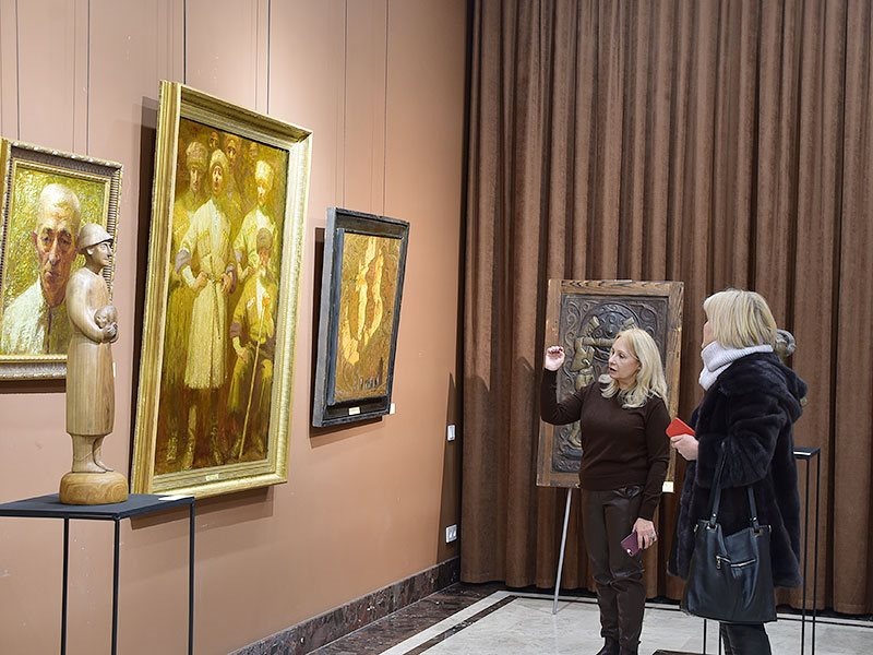 К сожалению, нашему путешествию в историю препятствует закрытая дверь по уже известным причинам, и мы спускаемся на первый этаж, где сегодня располагается Выставочная галерея. Там тоже разместилась уникальная выставка "Фамильные коллекции. Династии. Живопись, скульптура, ДПИ". Каждая работа заслуживает внимания. Но лучше рассматривать ее с экскурсоводом. То, что рассказала нам Елена, бесценно.