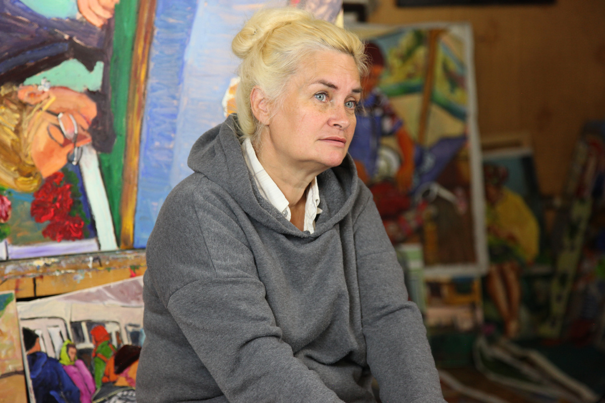 Лариса: Вообще, работы у меня современные. Откуда берутся сюжеты моих работ? Я хожу и я наблюдаю. Есть такое понятие , хотя кто-то не признает это, как женская живопись и мужская живопись. Если мужчина видит более общие моменты, то женщина видит в мелочах. Поэтому я замечаю, как люди ходят, как они стоят, как они разговаривают, общаются. Мне это очень интересно. Я в своих картинах через их позы, через их движения, через их какие-то состояния я пытаюсь выразить их сущность, их внутренний мир. Делать какие-то эскизы, зарисовки.