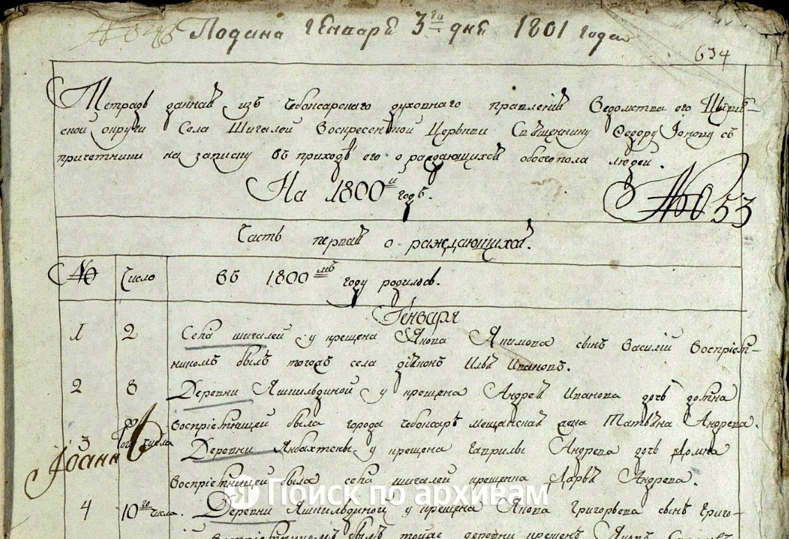 1. 2 числа. Села Шигалей у крещена Якова Якимова сын Василий. Восприемником был того ж села диакон Илья Иванов.