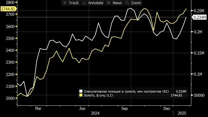 Тарифная политика Трампа вызывает опасения возобновления глобальной торговой войны, что усилит инфляцию и нанесет ущерб экономическому росту. Динамика цен на золото и нетто-позиции спекулянтов, по данным CFTC (Комиссии по фьючерсной торговле). Инвестиционные менеджеры повысили свои ставки на золото до максимума с октября, поскольку неопределенность в отношении политики президента Дональда Трампа повысила спрос на драгоценный металл, имеющий статус защитного актива. Хедж-фонды и другие крупные спекулянты увеличили чистые длинные позиции на 10% до 234 358 контрактов за неделю, закончившуюся 21 января, на следующий день после инаугурации Трампа. Согласно данным правительства США, опубликованным в пятницу, 24 января, этот показатель стал самым высоким за 12 недель. После выборов в США цены на золото взлетели как на американских горках, и решительная победа Трампа первоначально вызвала распродажи, поскольку инвесторы устремились к более рискованным активам, связанным с его программой эконом