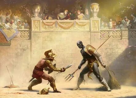 Выполнив перекат, я увидел как его сеть приземлилась на то место где я только что был. Первый удар моего меча пришелся по его руке с сетью, отрубив ее по локоть. Вторым ударом меч пошел вверх и сломал древко трезубца, сделав моего соперника безоружным. Толпа взревела и я решил что пора заканчивать наш древний танец. Не теряя инерции меч просвистел крест накрест и противник упал на песок Арены.
