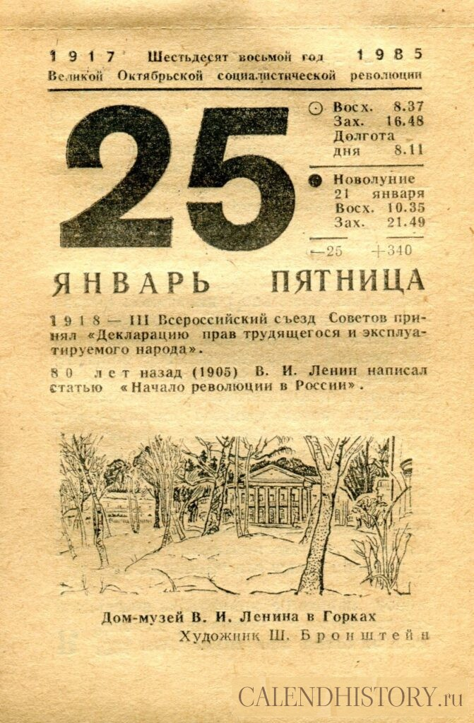 Итак, сегодня 25-го января и у нас на календаре 1985-й год. Перед нами листок советского календаря для женщин. На календаре у нас пятница - 25 января 1985-го года. 1918 — Всероссийский съезд Советов принял «Декларацию прав трудящегося и эксплуатируемого народа». 80 лет назад (1905) В. И. Ленин написал статью «Начало революции в России». Дом-музей В. И. Ленина в Горках