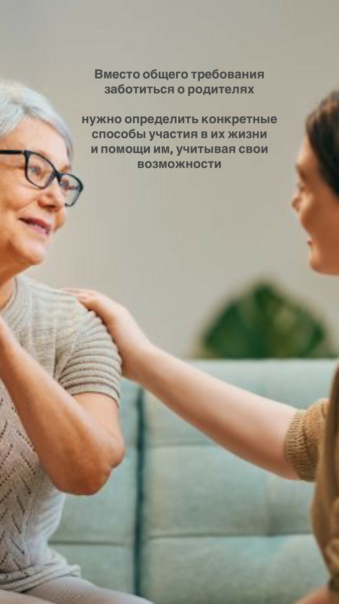 - Вместо общего требования заботиться о родителях нужно определить конкретные способы участия в их жизни и помощи им, учитывая свои возможности